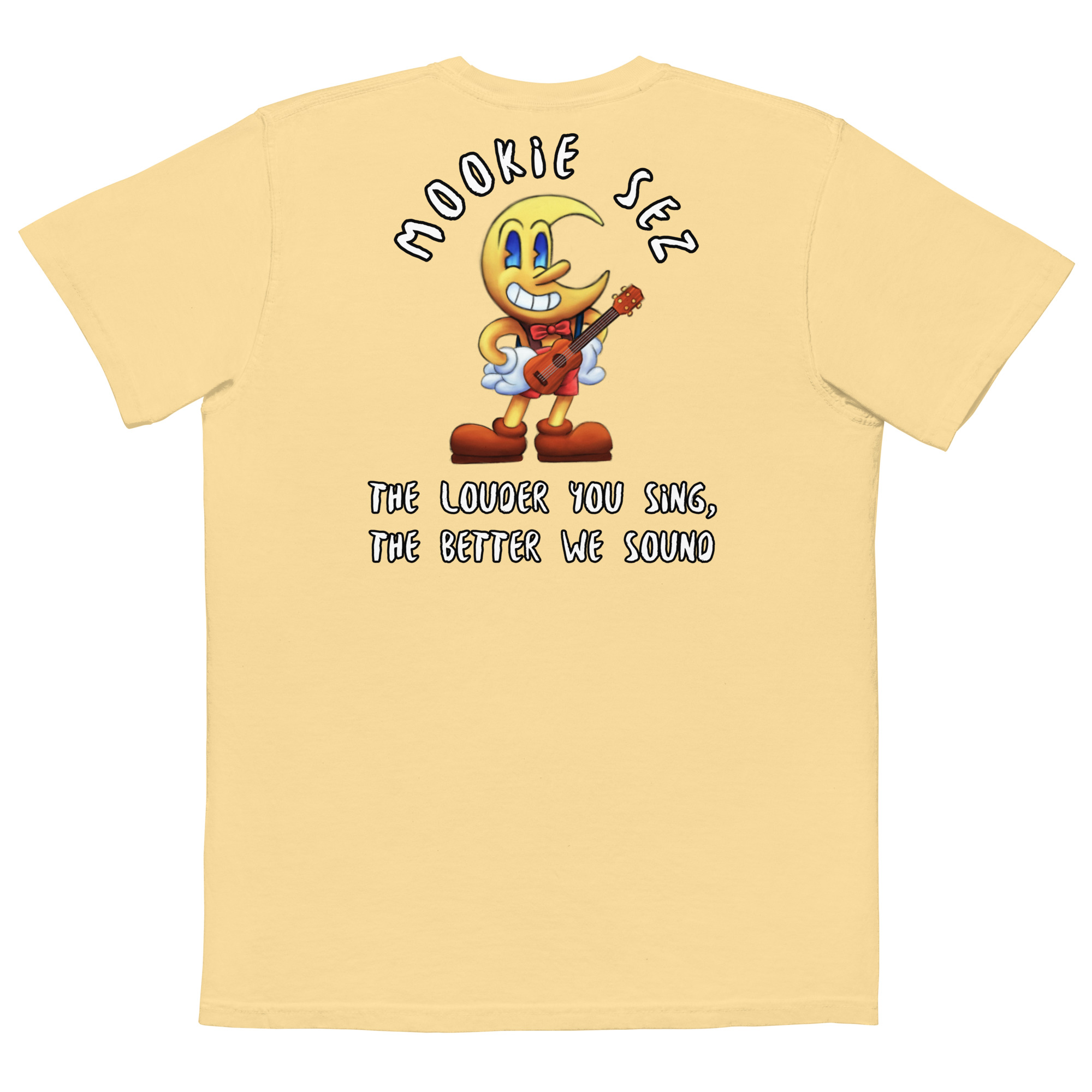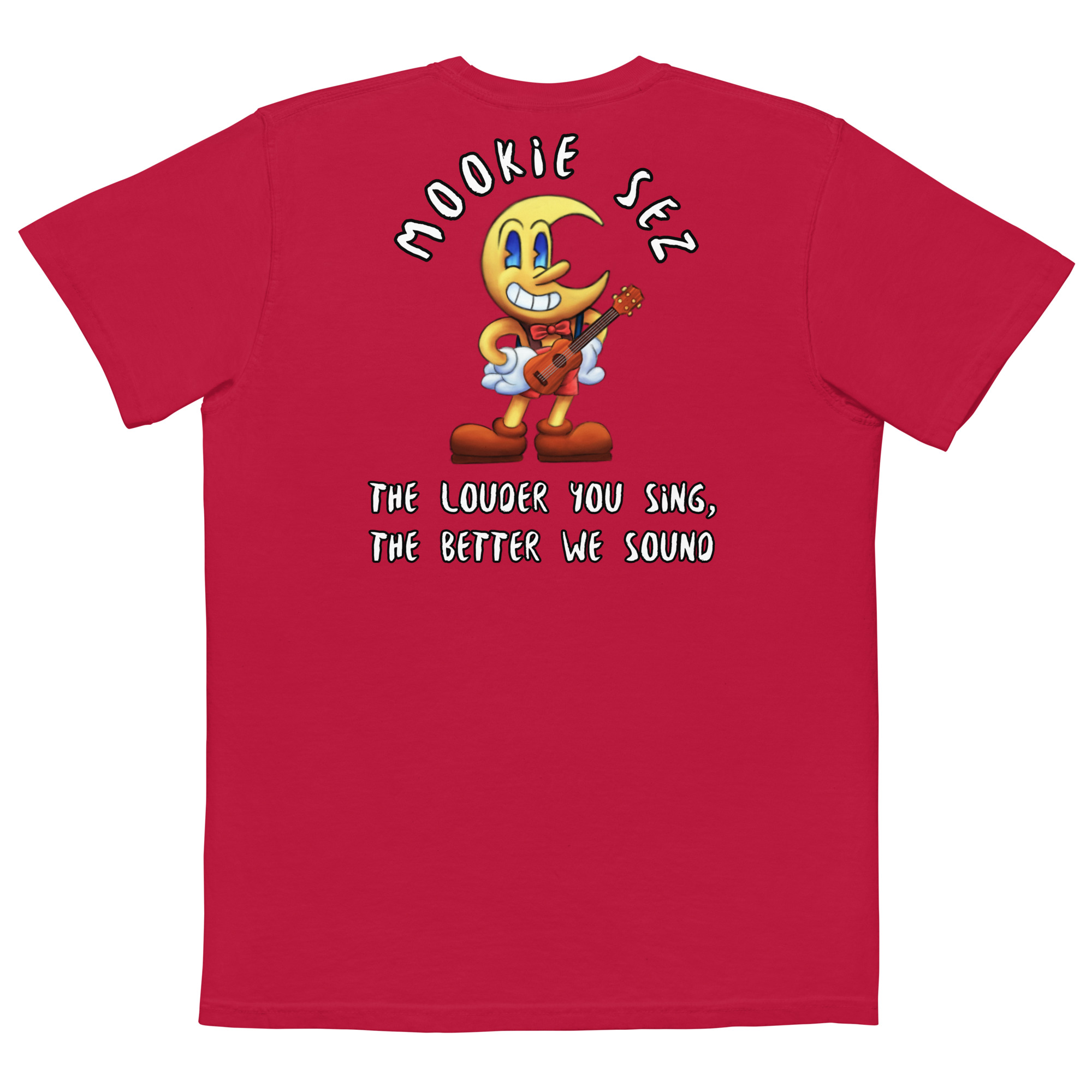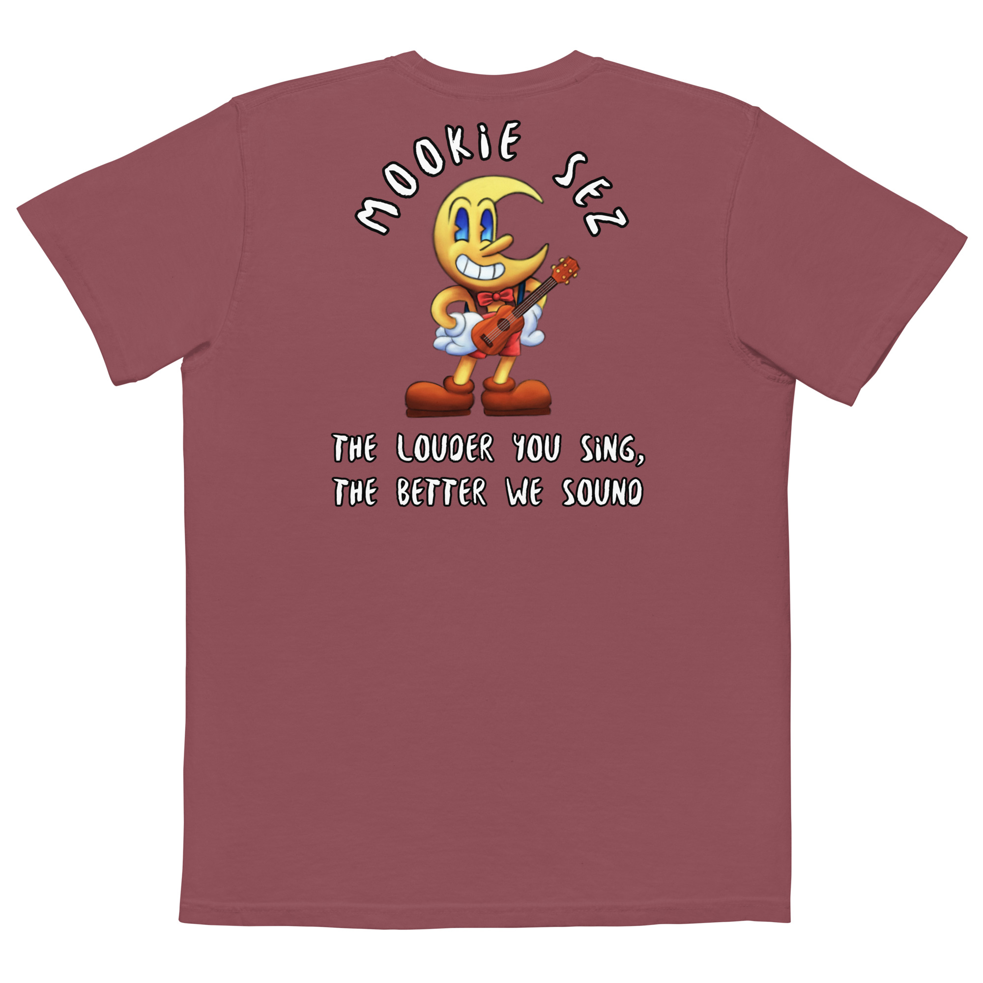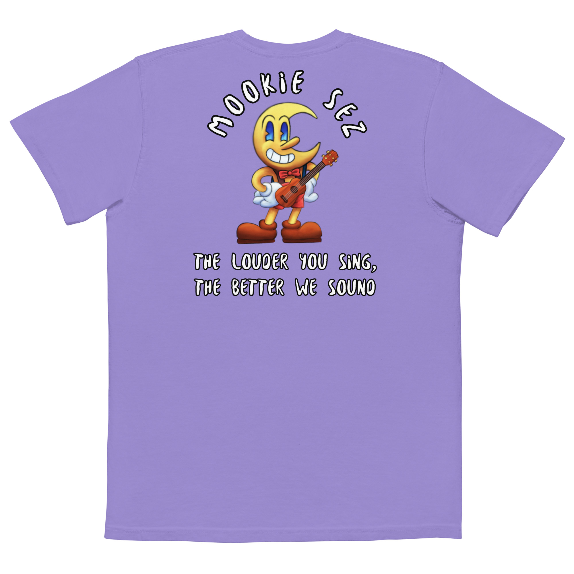 Mookie says, Why wear a T-shirt without a pocket when you can get this top-quality, Comfort Colors-brand T? It costs a little more than regular T’s, but it’s worth it for the perfectly sized front pocket for your kazoo or tuning gizmo.