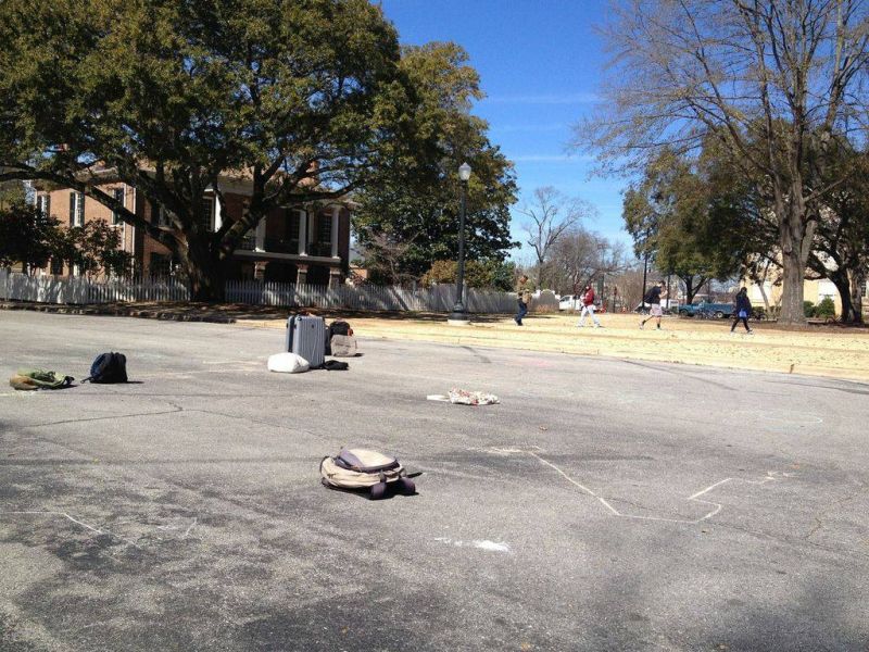 The zen garden near the Dead Mall that utilizes now lost luggage and discarded tote bags.